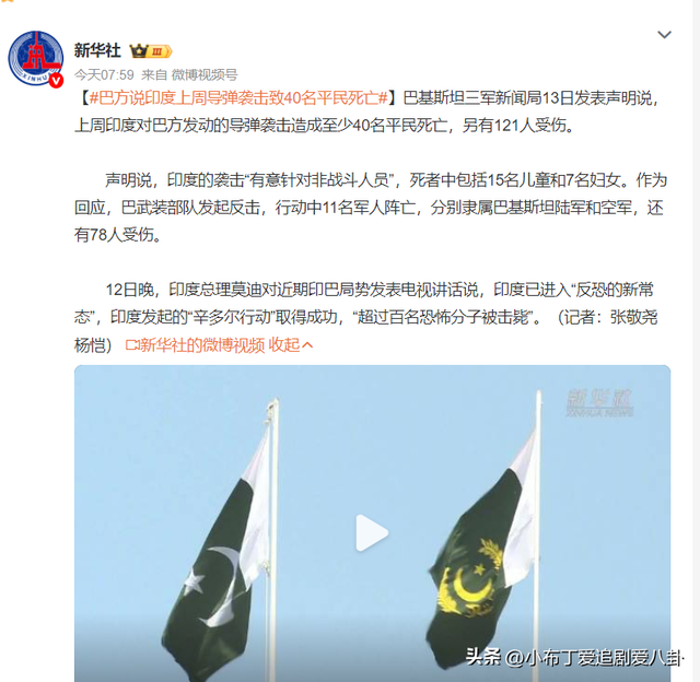 巴基斯坦三军新闻局13日发表声明说,上周印度对巴方发动的导弹袭击造成至少40名平民死亡,另有121人受伤。