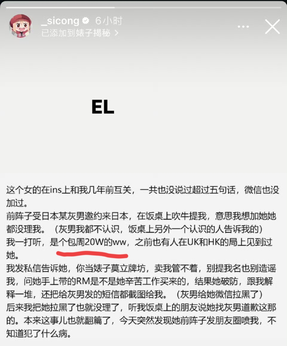 真正点燃战火的,是小李朋友圈一条暗指「某些富二代自视甚高」的动态。10 月 5 日下午,王思聪在认证账号直接发难:「某些小网红别给自己加戏,你是什么身份自己不清楚?外围一周 20 万,身上的爱马仕都是这么来的吧」,十分钟后更是附上小李的账号截图,直接将其推向舆论漩涡。