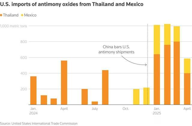 日前,我国从美国海关公布的数据中发现异常:在我国加强资源管控后,美国短期内从泰国、墨西哥等国采购了大量氧化锑,短短几个月的采购量便相当于 2022-2024 三年的总和。更值得注意的是,在中国实施禁令前,泰国和墨西哥在我国锑出口对象中排名前十之外,短短数月却跃升至前三。