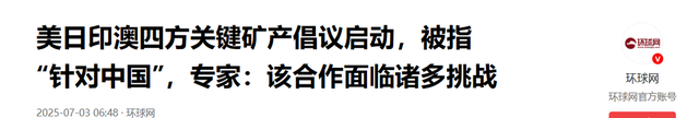 环球网——美日印澳四方关键矿产倡议启动,被指“针对中国”,专家:该合作面临诸多挑战——2025-07-03
