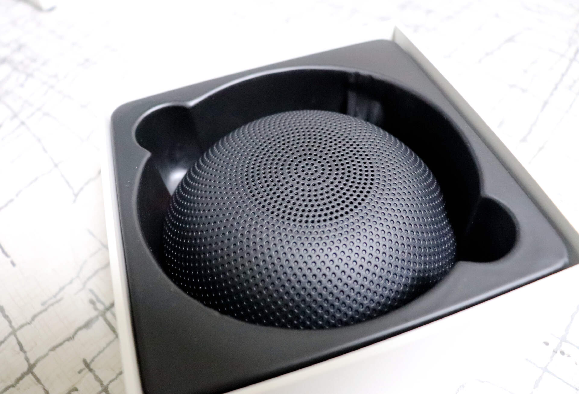 首先产品外包装采用简约风设计,封面内容比较中规中矩,印有产品的logo、图片、型号等信息。打开包装,音响通体黑色,形状像是两个圆钵体的碗扣在一起,侧面有一根红色硅胶挂绳,主要用于外出携带提着就走,非常方便。上半部分为音响的扬声器,呈网眼状的结构,下半部分为普通亲肤塑料,印有西圣的LOGO,底部为防滑垫设计,放在桌上也很稳固,同时也是音响的操作控制台,能进行开关机、切换歌曲等功能。音响整体重量约为230g。