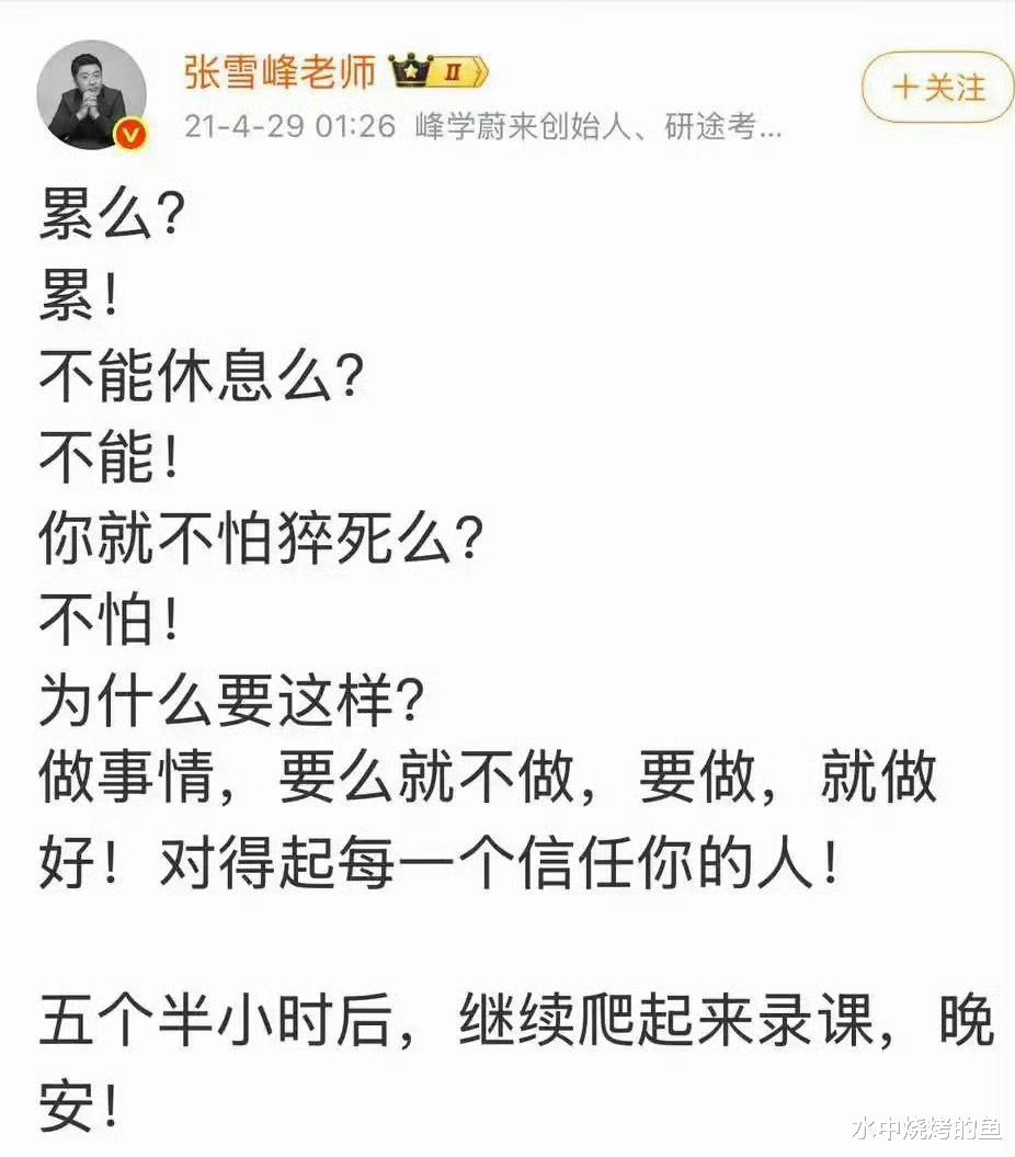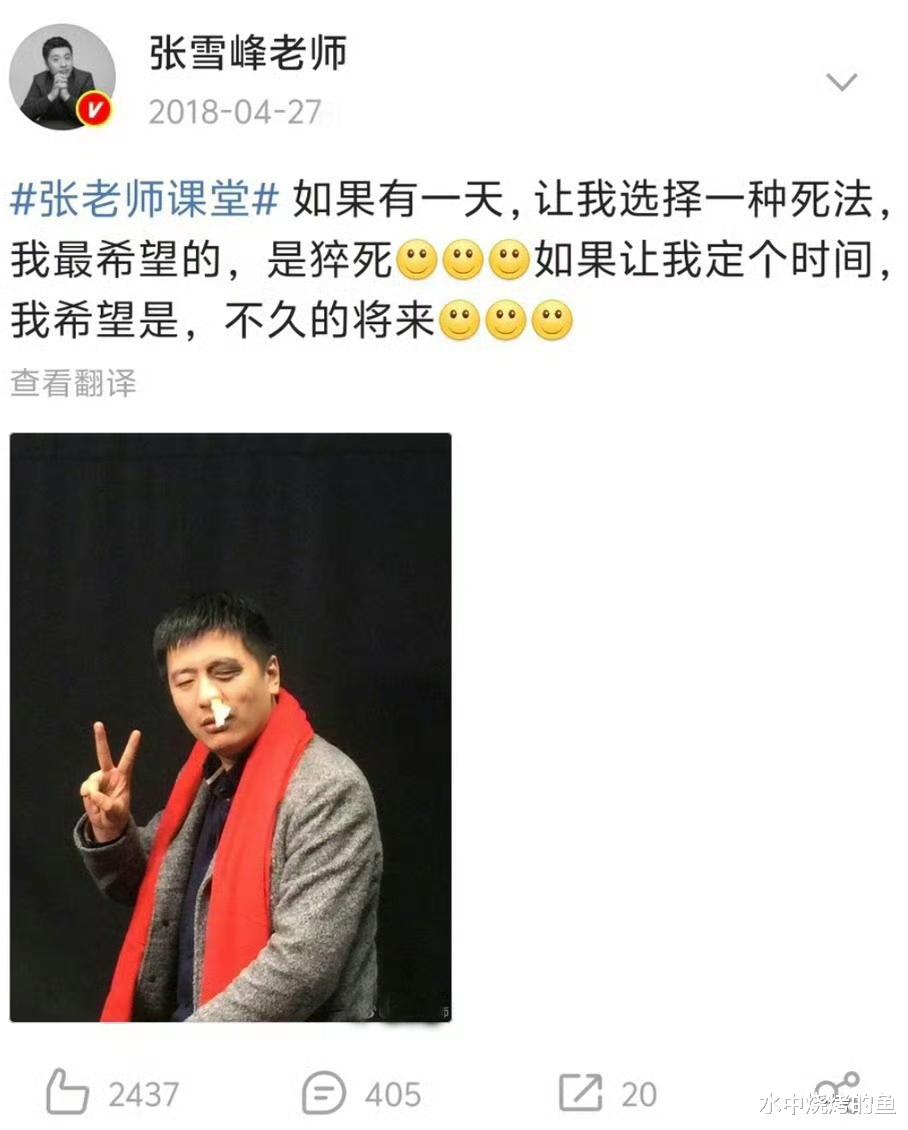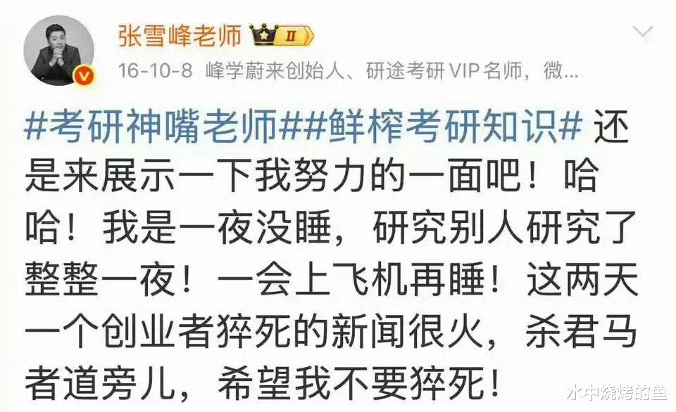 而翻看张雪峰的社交媒体,博文中多次提到“猝死”“累死”这样的字眼。2018年的一条博文中,他提到“如果有一天,让我选择一种死法,最希望的是猝逝”。