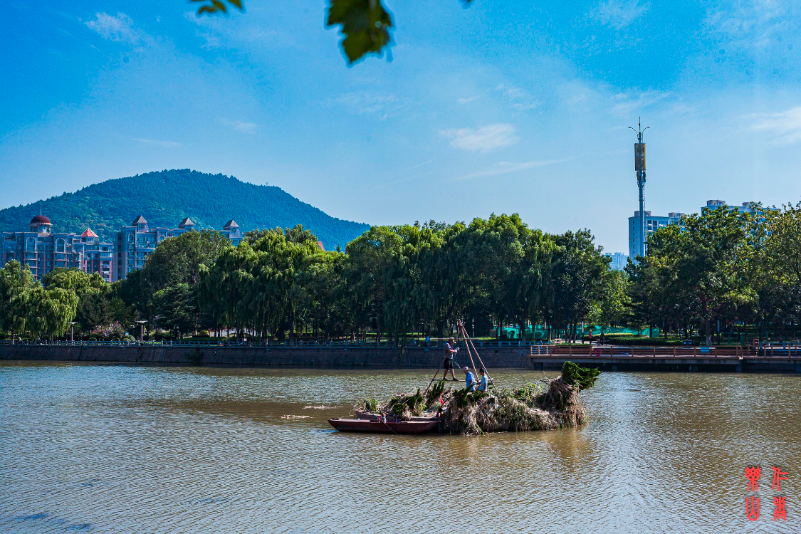 当我们待在空调屋里还觉得不甚舒服时,螳螂河中辛劳的园林工人们却头顶烈日、扎着脚架,紧张忙碌地清除洪水冲下来的淤柴和杂草。汗水湿透了他们的衣衫,背上都是一片片白花花的盐旮旯……