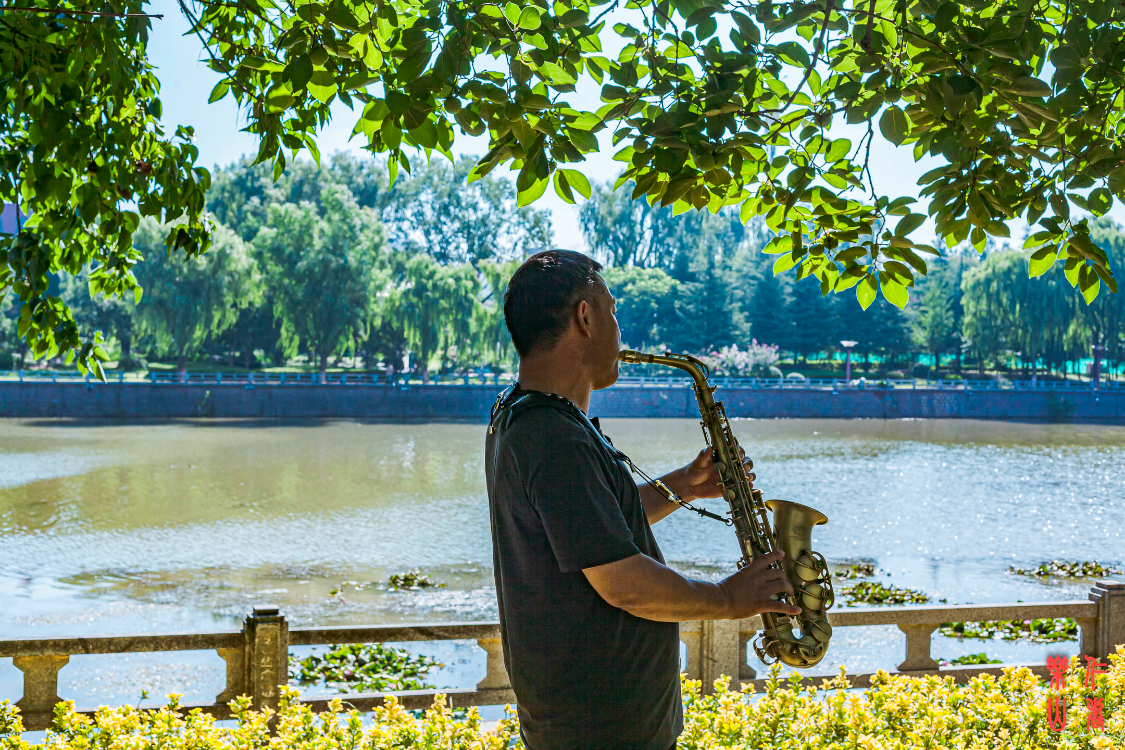 再来到上游西城华府一带,一位放假的老师正在吹奏着一曲萨克斯《我爱你中国》。征得他同意,逐在花圃中用逆光大光比为其拍摄了一组美轮美奂的图片。