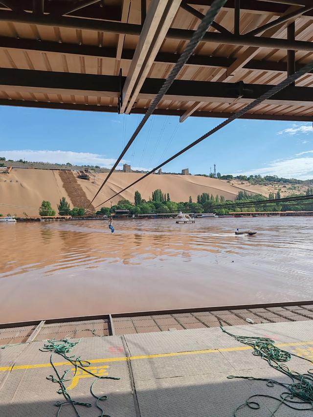 下了快艇乘坐缆车上行,去玩飞黄腾达,就是200米高空横渡黄河,然后再滑回来,说实话看着有些吓人,可自己滑上后感觉很爽,没有一点害怕。很想多滑几次!我们又是不用排队第一名啊。这就是早到的好处了,因为当天人流高峰时很多人顶着烈日排了两个多小时的队。