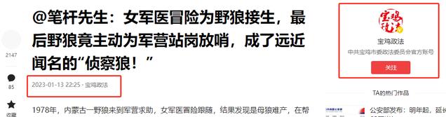 宝鸡政法:《@笔杆先生:女军医冒险为野狼接生,最后野狼竟主动为军营站岗放哨,成了远近闻名的“侦察狼!”》-2023-1-13