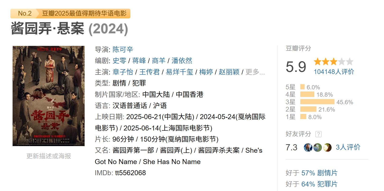 02,目前,《酱园弄·悬案》在豆瓣评分只有5.9,是章子怡主演的电影中评分最低的一部。