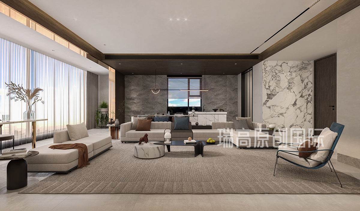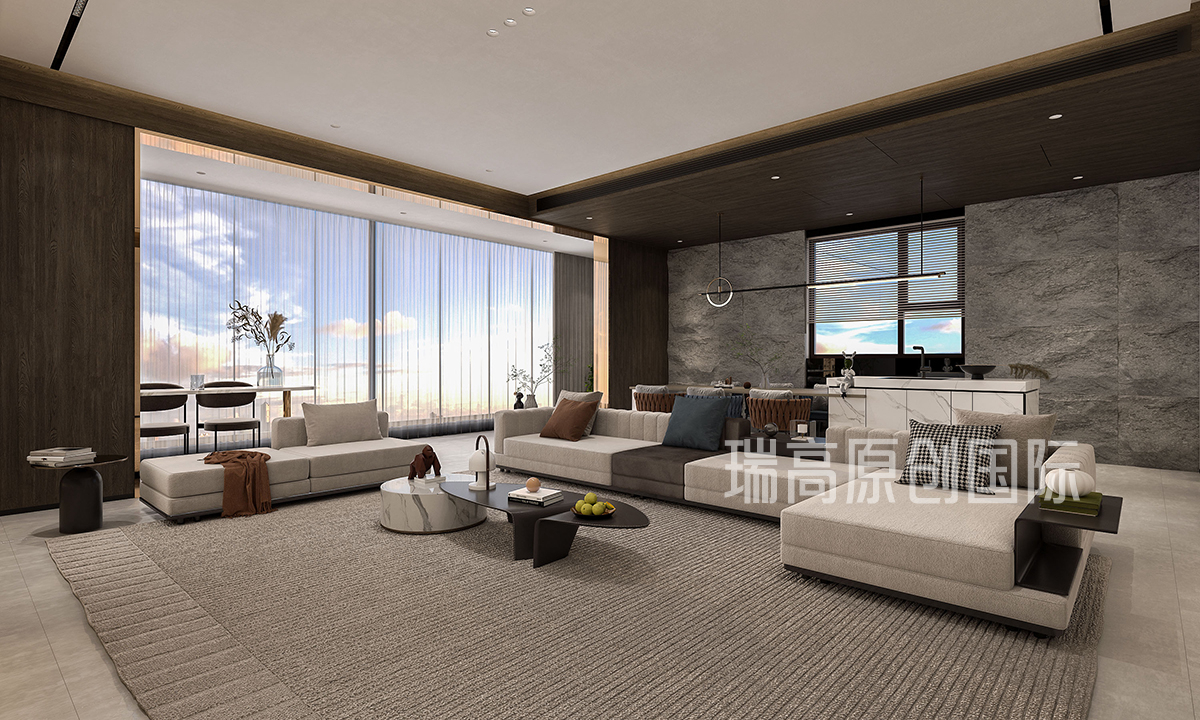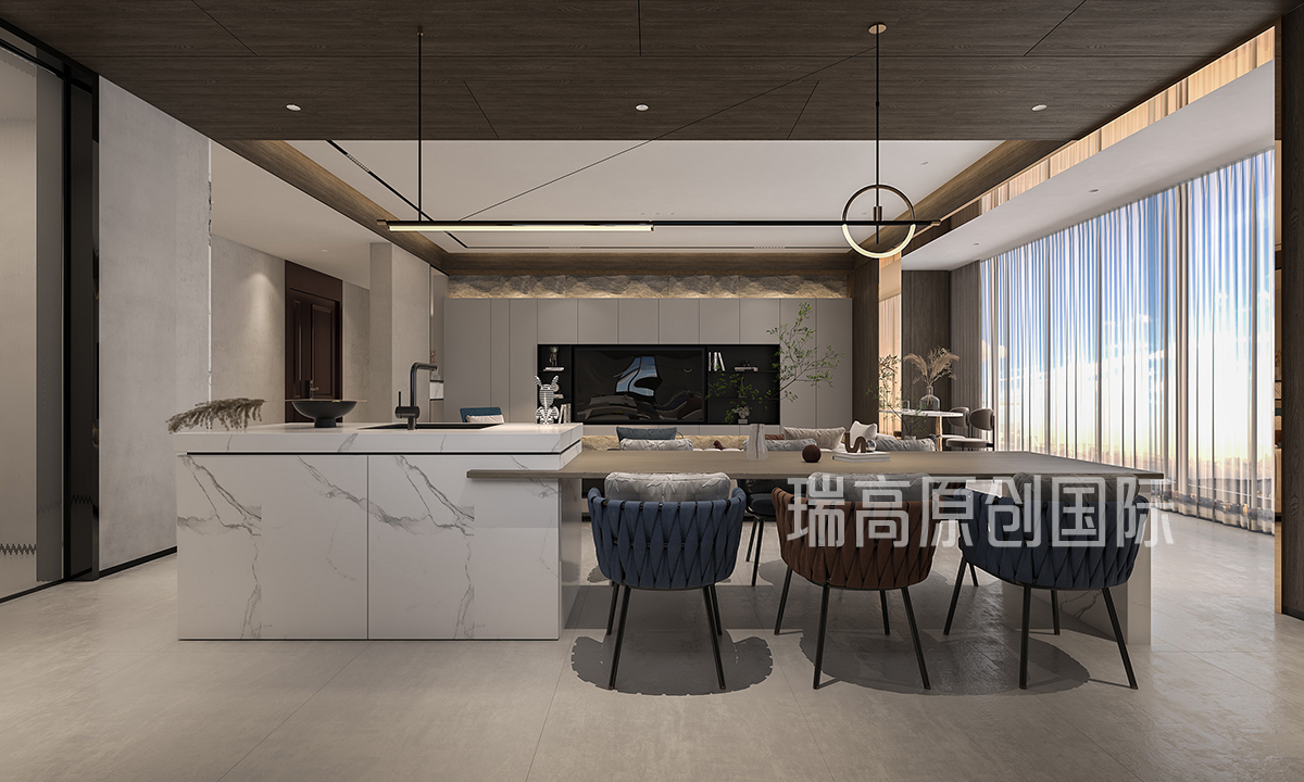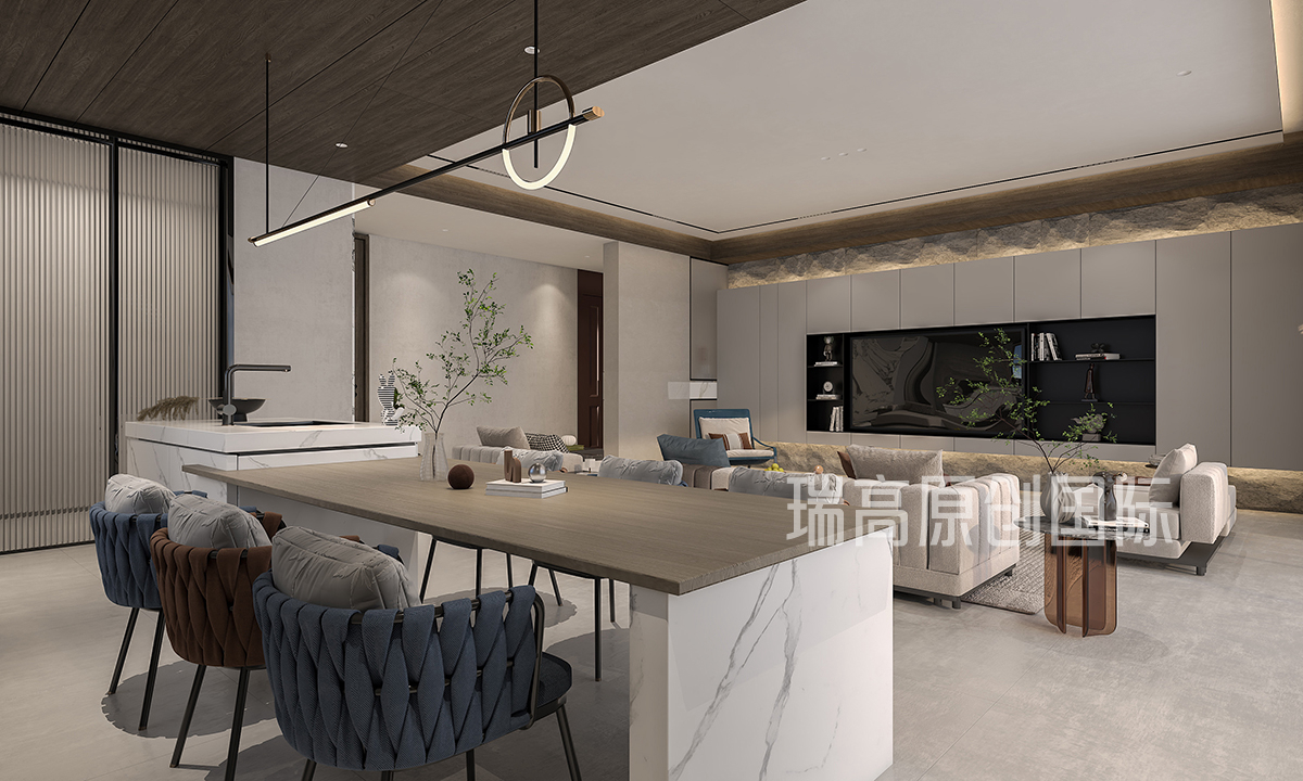 客餐厅一体式的设计,多种材料的灵活应用,大的环绕式沙发和餐岛一体式的餐桌使整个空间稳重又宁静,石材、大理石、木材和植物的点缀又赋予了空间自然的动态。