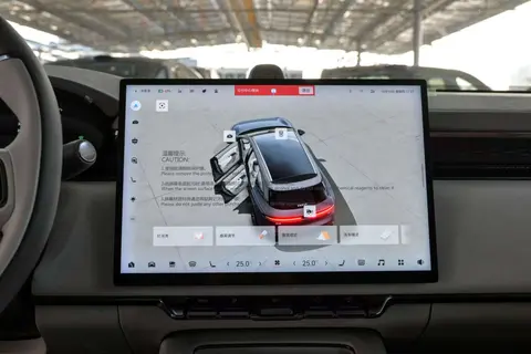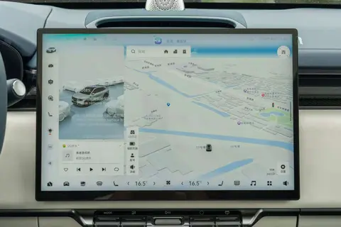 打开车门,内饰的设计同样让我惊艳。浅灰色的皮质座椅搭配深棕色的木纹饰板,营造出一种温馨又高级的氛围,完全没有传统车内饰的塑料感。中控台采用了“无边界”设计,16英寸的中控屏与10.25英寸的仪表盘连为一体,屏幕分辨率很高,操作流畅度不输家里的平板电脑。值得一提的是,车内的用料非常扎实,触手可及的地方都是软质包裹,就连门板下方也用了皮质材料,孩子靠在上面不会觉得硌。