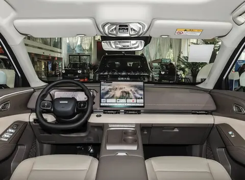内饰以“舒适与实用”为核心,提供纯黑色、黑棕和米棕三款内饰配色,满足不同用户的审美需求。环抱式座舱采用大面积软性材质包裹,搭配细腻的缝线工艺与金属饰条点缀,质感媲美更高价位车型。中控台配备12.3英寸全液晶仪表与14.6英寸悬浮式中控屏的组合,内置高通骁龙芯片加持的智能车机系统,指令响应迅速,支持全域语音控制与前后排飞屏联动。
