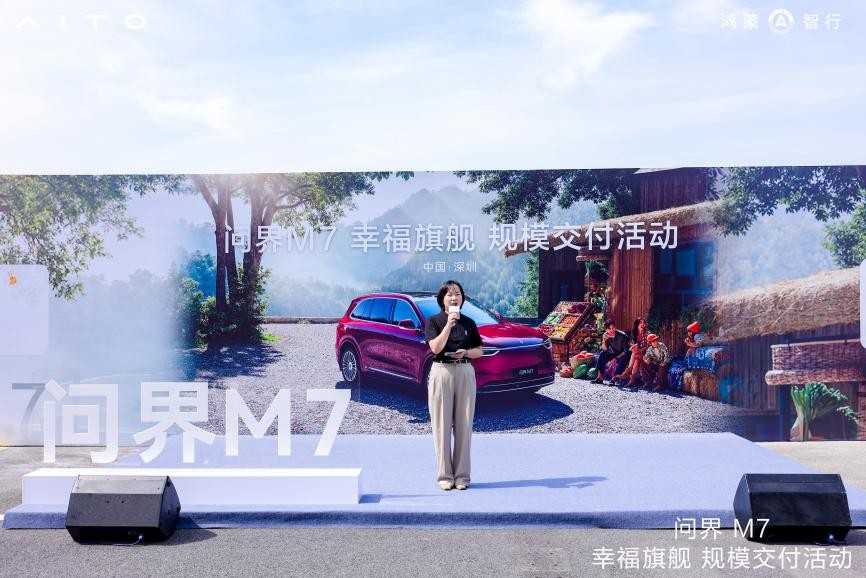 10时整,交付仪式在主持人充满活力的开场中正式开启。AITO问界深圳区域用户增长经理黄蕾女士登台致辞,向到场的所有车主及家人表示了热烈的欢迎与感谢。黄蕾女士表示:“自9月23日全新问界M7上市以来,上市仅1小时,大定突破3万台;上市7天,大定攀升至6万台,创造了新的纪录。这些数字的背后,是消费者对问界M7产品力的高度认可。 ”黄蕾女士的深情寄语,道出了品牌的核心价值观,赢得了全场阵阵掌声。