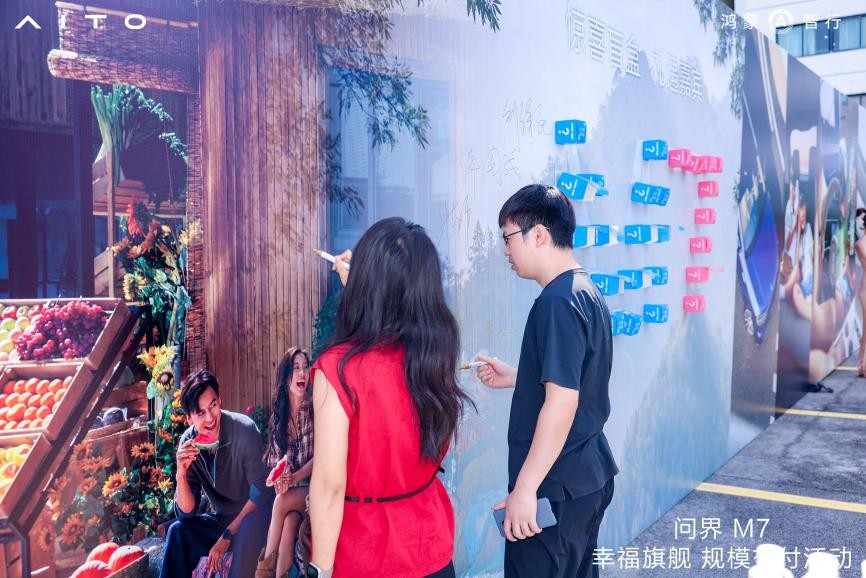上午9时30分,活动在愉悦的氛围中拉开序幕。车主们陆续抵达活动现场,在品牌工作人员的热情引导下,开启了一段独特的体验之旅。在签到环节,车主们开启惊喜盲盒,并用金色油漆笔在专属签到板上郑重签名,留下与AITO问界首次共鸣的印记。随后,车主们循着指引,积极参与到360环拍、手印墙及签名墙等互动环节中。镜头记录下他们灿烂的笑容,手印与签名汇聚成一道属于问界车主大家庭的独特风景线,每一处细节都承载着品牌对用户归家的诚挚欢迎与尊崇礼遇。