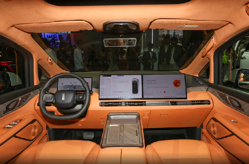 拉开车门,进入高山8的座舱,“T”字形中控台提供云朵白和霞光橙两种配色风格,用户可根据自己的审美来选择。15.6英寸的中控屏与副驾娱乐屏悬浮在中控台上,有着很强的冲击力,一下子就吸引了人的视觉重心。该款车内置高通骁龙8295芯片,车机操作逻辑清晰、流畅度高,使用中相当便利。粗壮的方向盘正前方还保留了12.3英寸全液晶仪表,不过有了26英寸HUD抬头显示系统加持,仪表盘的利用率并不高。50W手机无线充电面板带风冷系统,使用中也不用过分担心散热问题。
