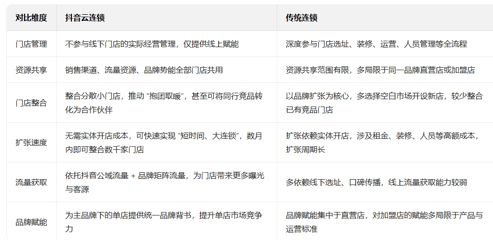 相较于传统连锁模式,抖音云连锁在运营逻辑、资源整合、发展速度等方面呈现出显著差异,具体可从以下维度区分: