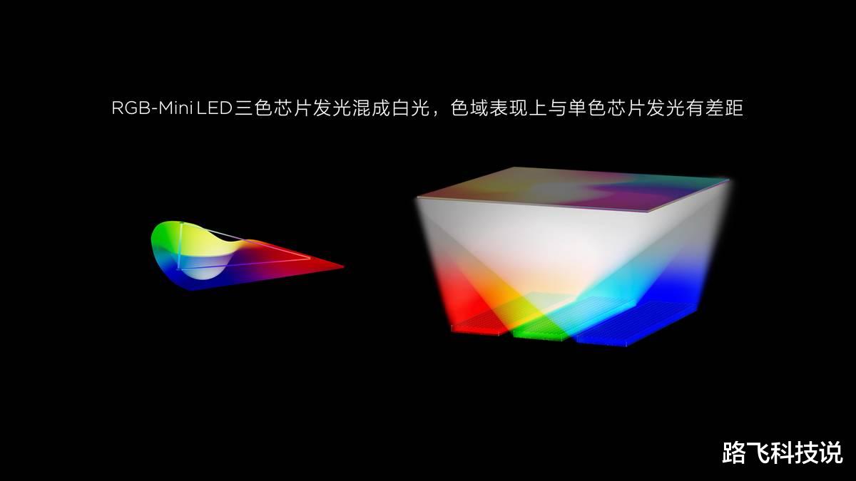 目前市面上普通的RGB-Mini LED电视,用的是红、绿、蓝三颗灯珠组合发光,虽然在显示纯色画面时,能靠调校达到97%-100% BT.2020 色域,但一到多色复杂场景,比如电影里的热带雨林镜头,红、绿、蓝三色光相互干扰,色域就会暴跌到85%以下,有的甚至更低。更麻烦的是,这三颗灯珠的衰减速度不同,红色灯珠衰减最快,绿色次之,蓝色最慢,用个一年半载,画面就会慢慢发青。