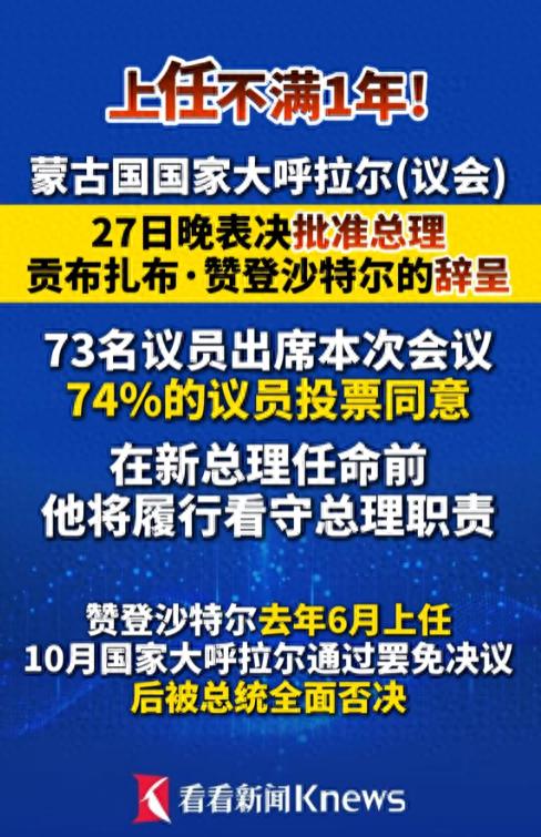 1.上任不满1年!蒙古国总理递交辞呈获议会批准——2026-03-28 08:26·看看新闻