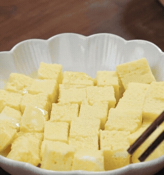 接下来,把切好的馒头块倒进蛋液里,用手抓一抓,每一块都裹满蛋液。