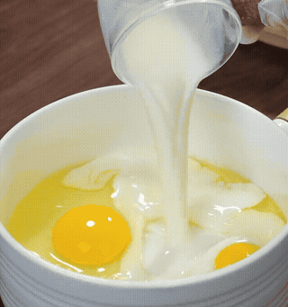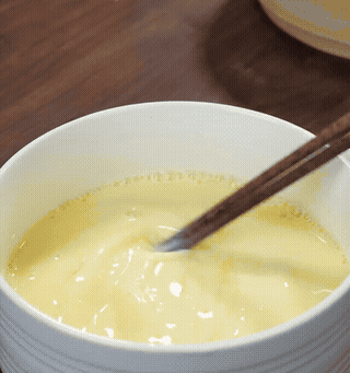 用筷子充分搅拌,一定要打散打匀,蛋液和牛奶混合彻底。