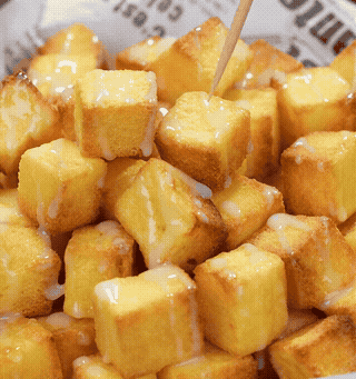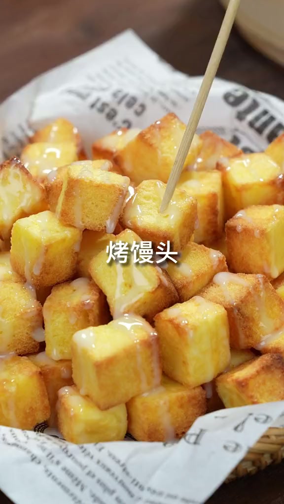 时间到了,炸好的馒头块金黄酥脆,口感老好了。盛出来,淋点炼乳或者撒点糖粉,简直绝了。