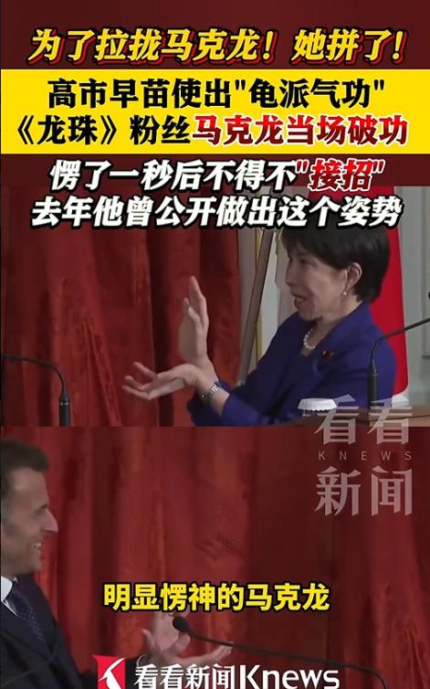 最近还有让外界大跌眼镜的一幕,4月1日法国总统马克龙访日,在日法首脑联合记者会后,高市早苗突然对马克龙摆出《龙珠》经典招式 "龟派气功"。