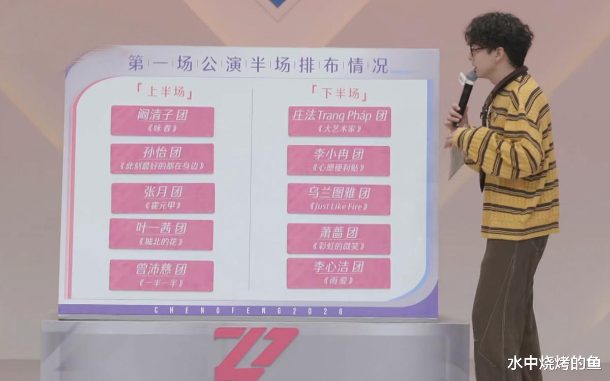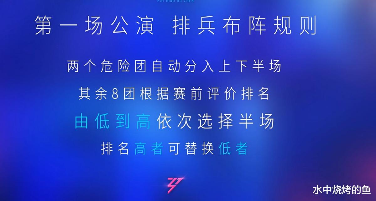 《浪姐7》一公舞台,10个团分上下半场参与竞演,每半场5个团,赛前评价危险团自动分入上下半场。