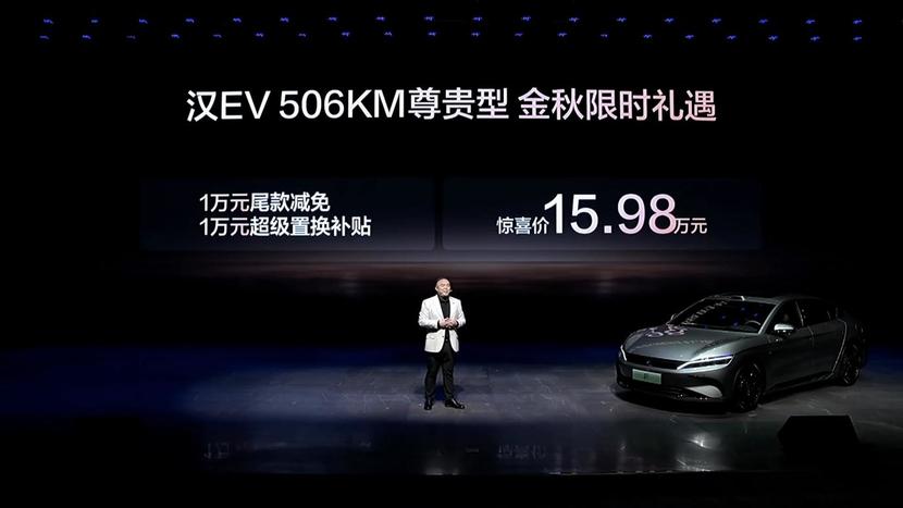 与此同时,针对搭载第五代DM技术的汉DM-i,比亚迪更将陆续推送油耗OTA,让车辆百公里亏电油耗从3.8升降低至3.35升,使车辆的能耗表现跃升至新高度!对于一直热销的汉EV 506KM尊贵型,比亚迪特别推出金秋限时礼遇,限时购车可享1万元尾款减免,再加1万元超级置换补贴(以上权益截至10月31日),惊喜价15.98万元!
