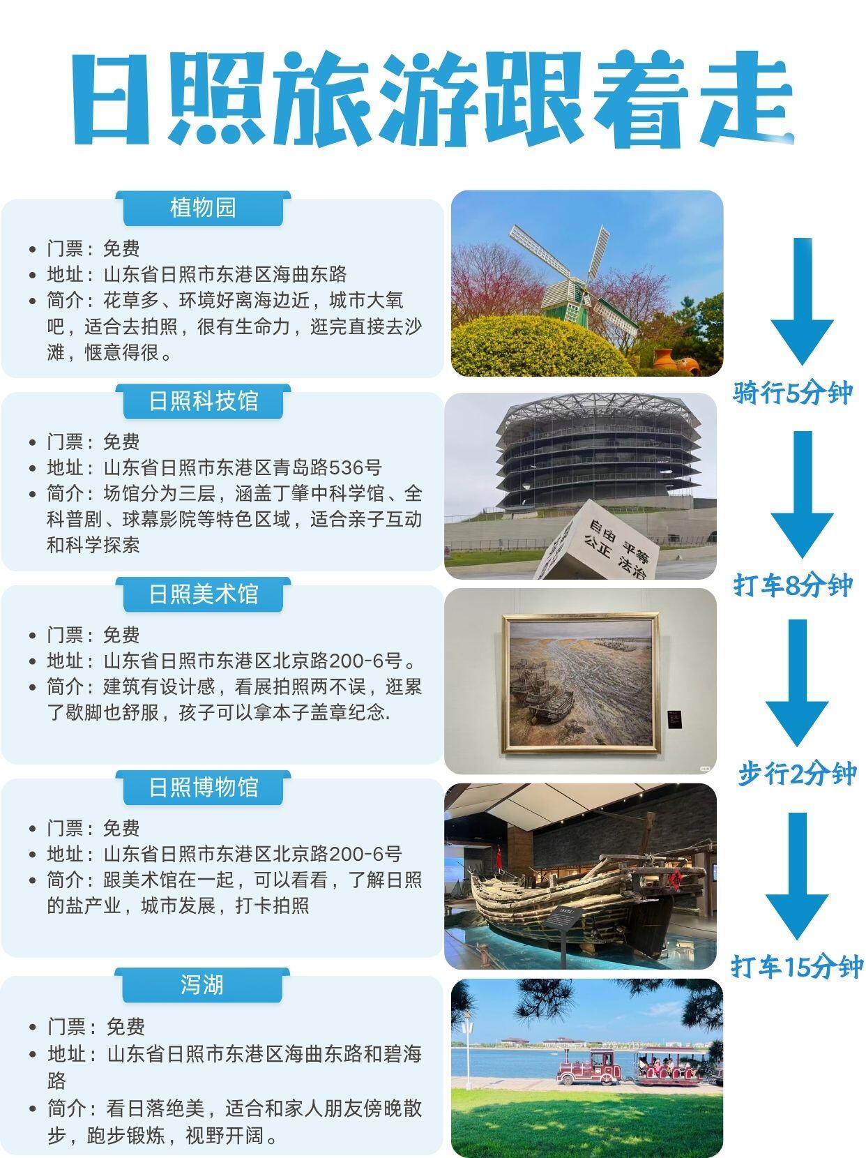 Day2:植物园(海边氧吧拍照)→日照科技馆(亲子科普)→美术馆 + 博物馆(建筑 & 文化打卡)→泻湖(傍晚看日落)