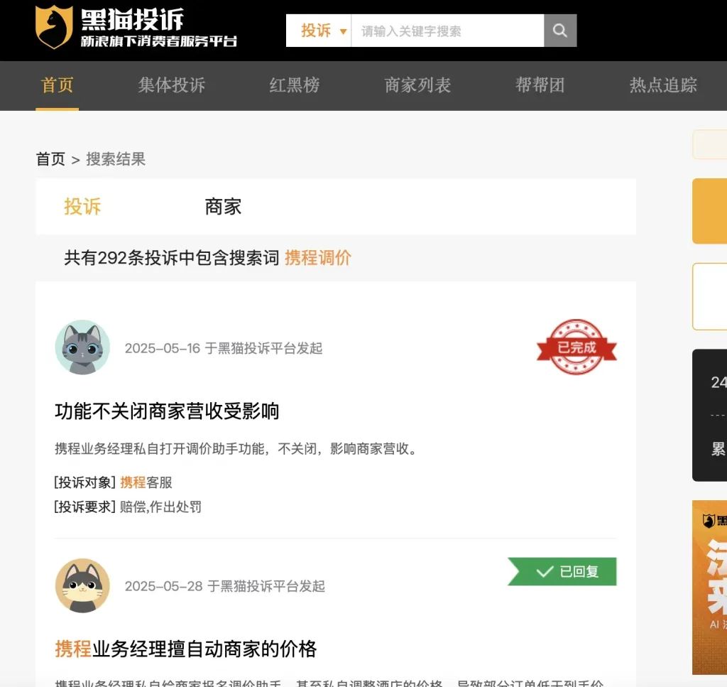 公开资料显示,2025年底,关于携程“调价助手”强制改价的投诉开始集中爆发,其中“调价助手”强制开通、无法退出成为商家投诉的焦点。