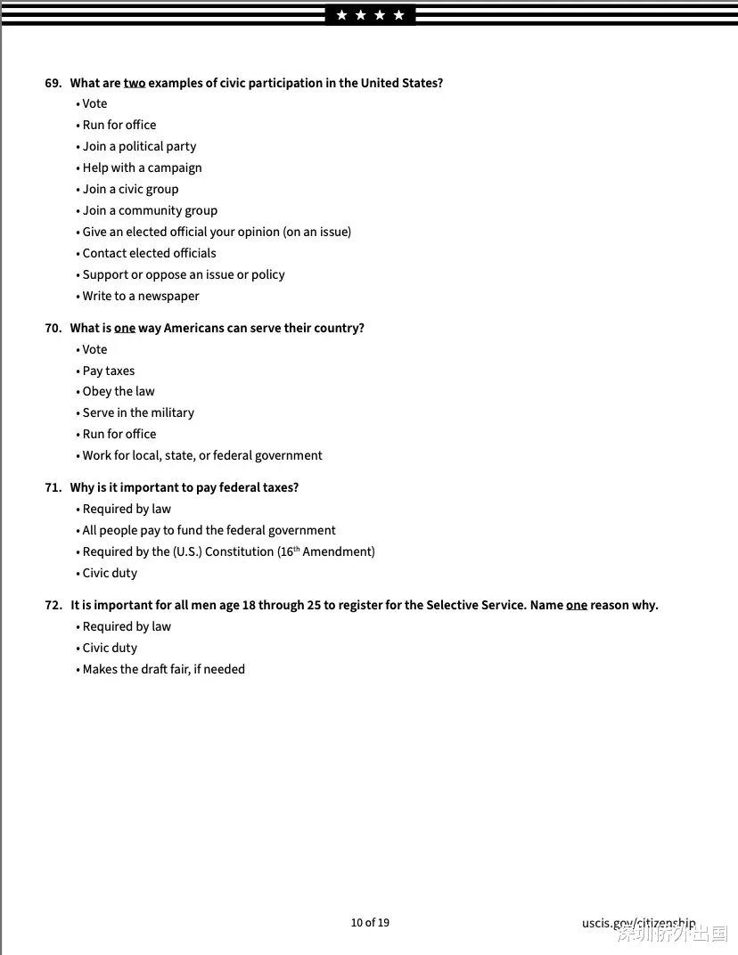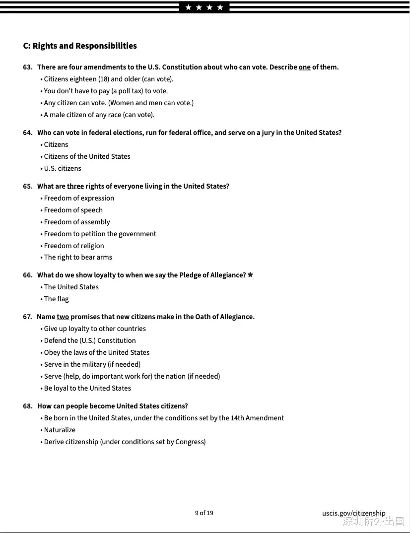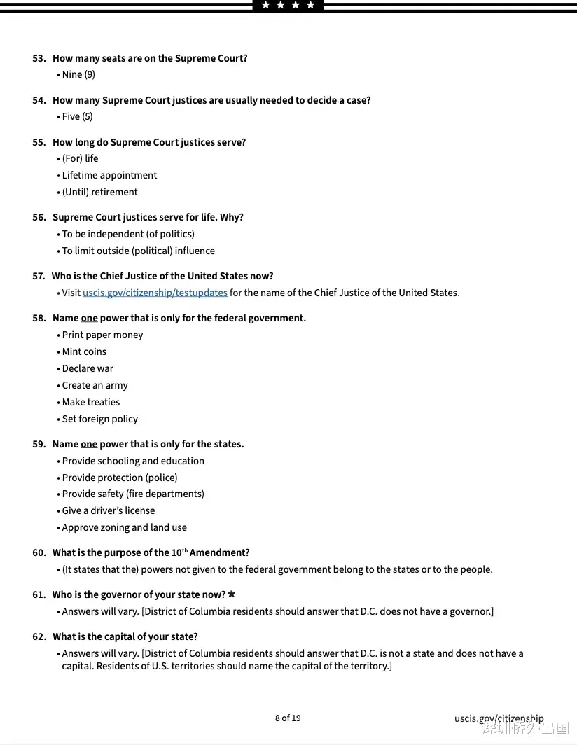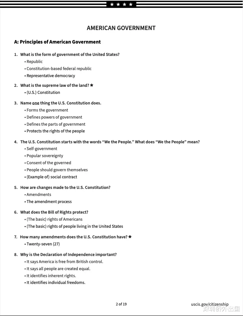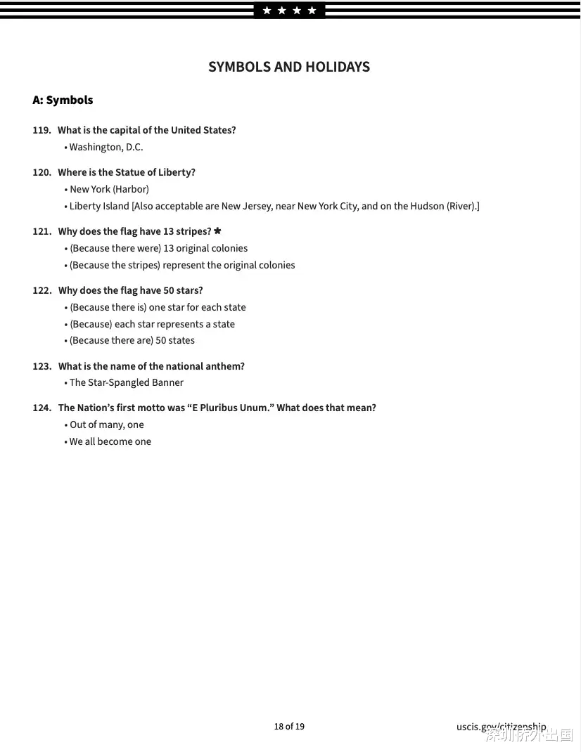 移民局公布的英文版完整题库如下: