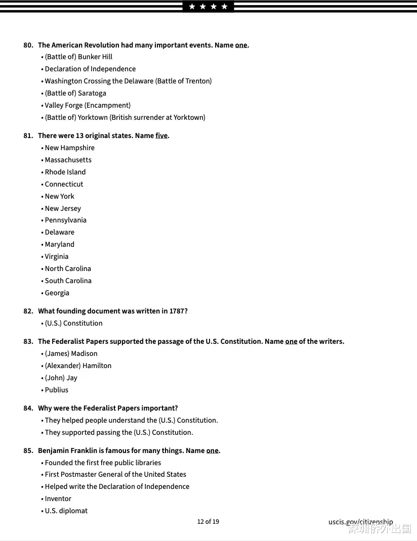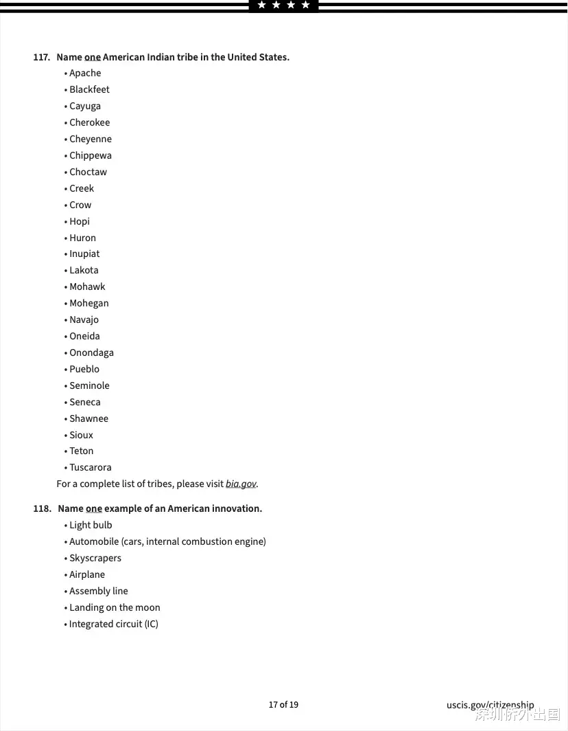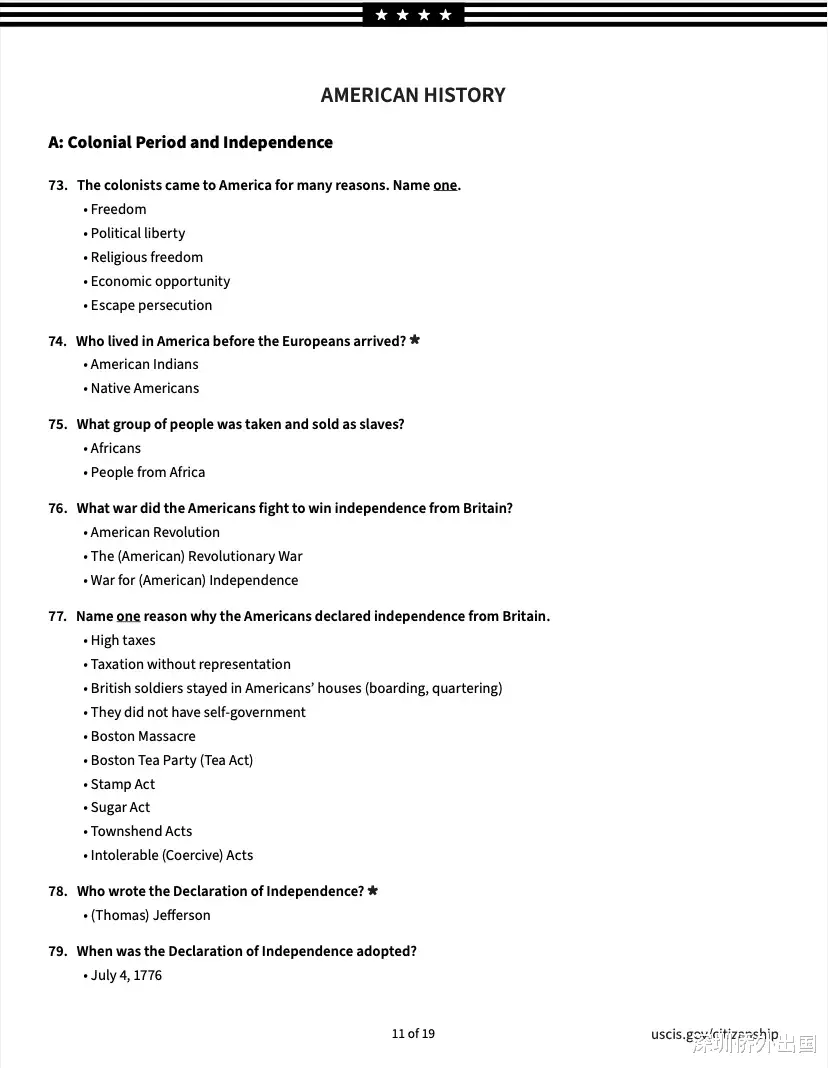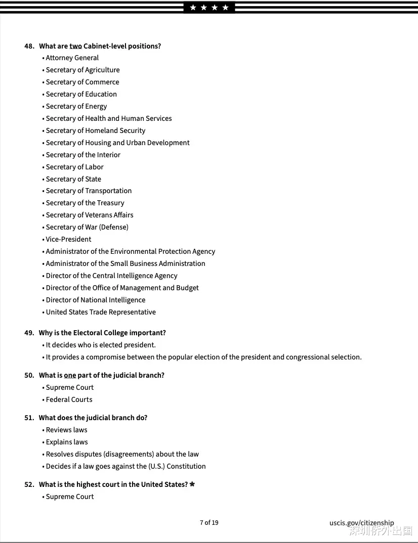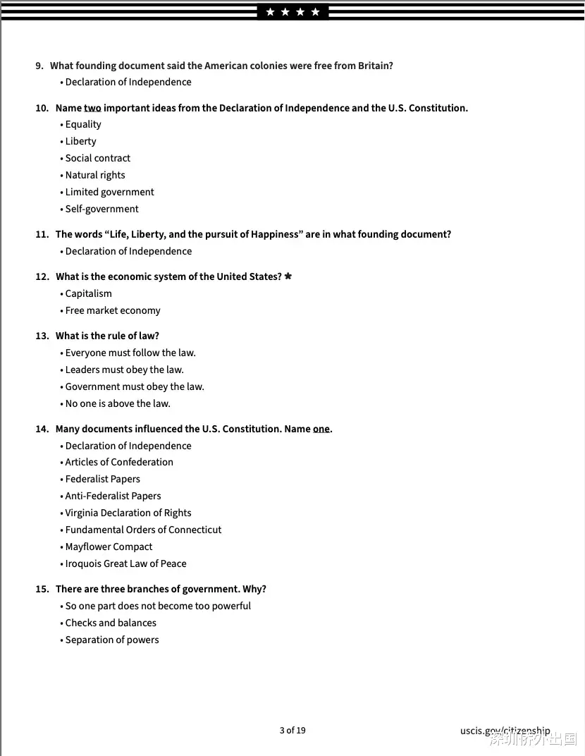 移民局公布的英文版完整题库如下:
