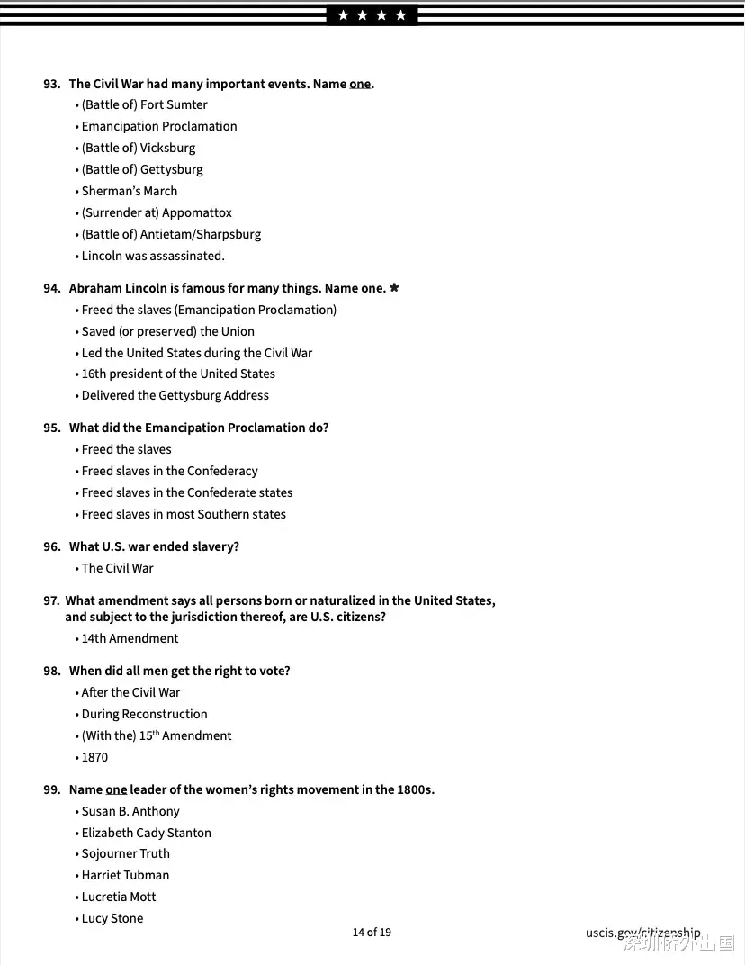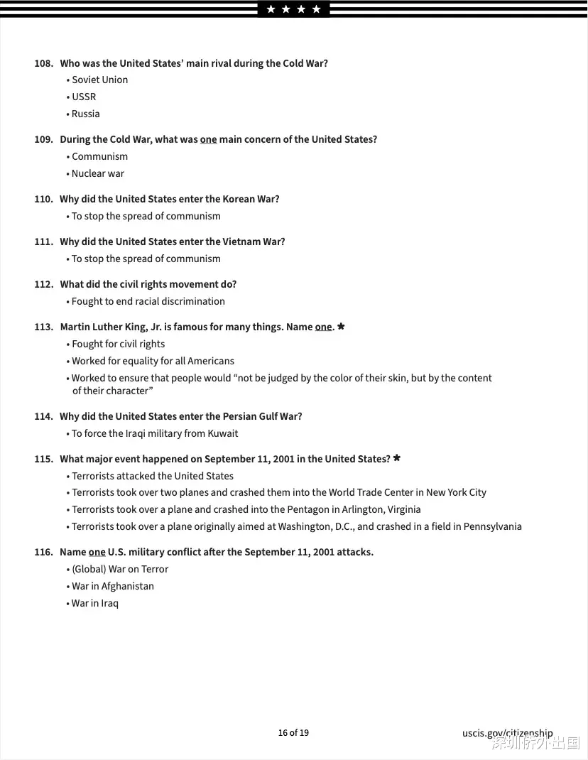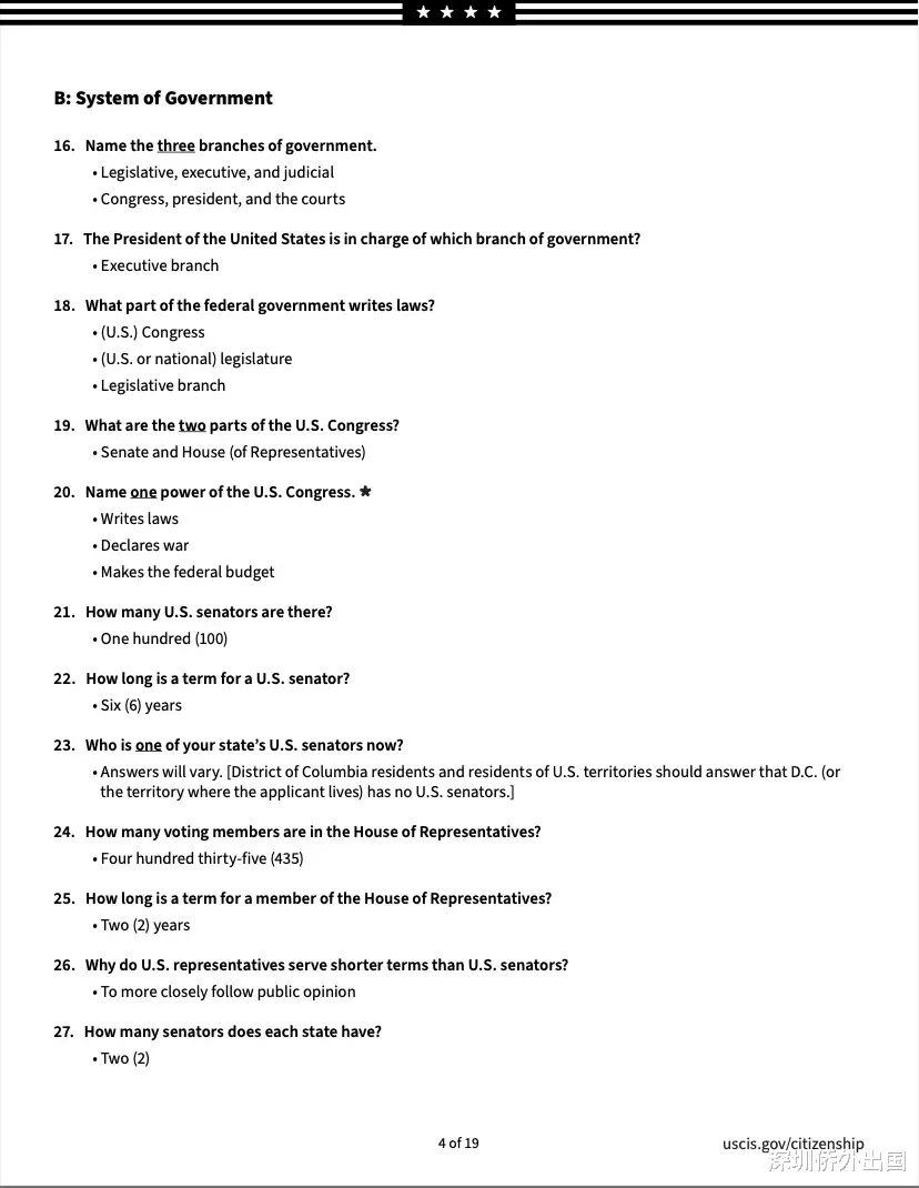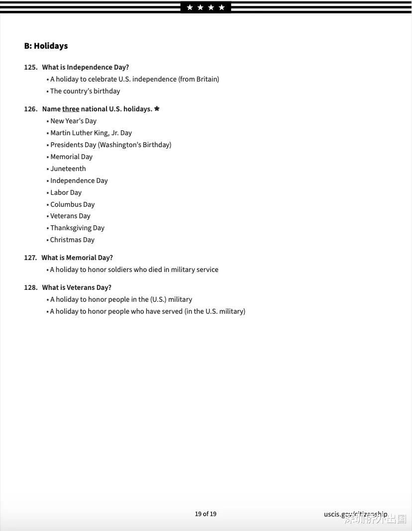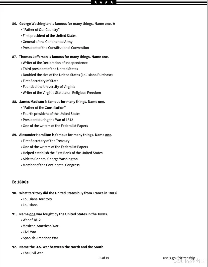 移民局公布的英文版完整题库如下: