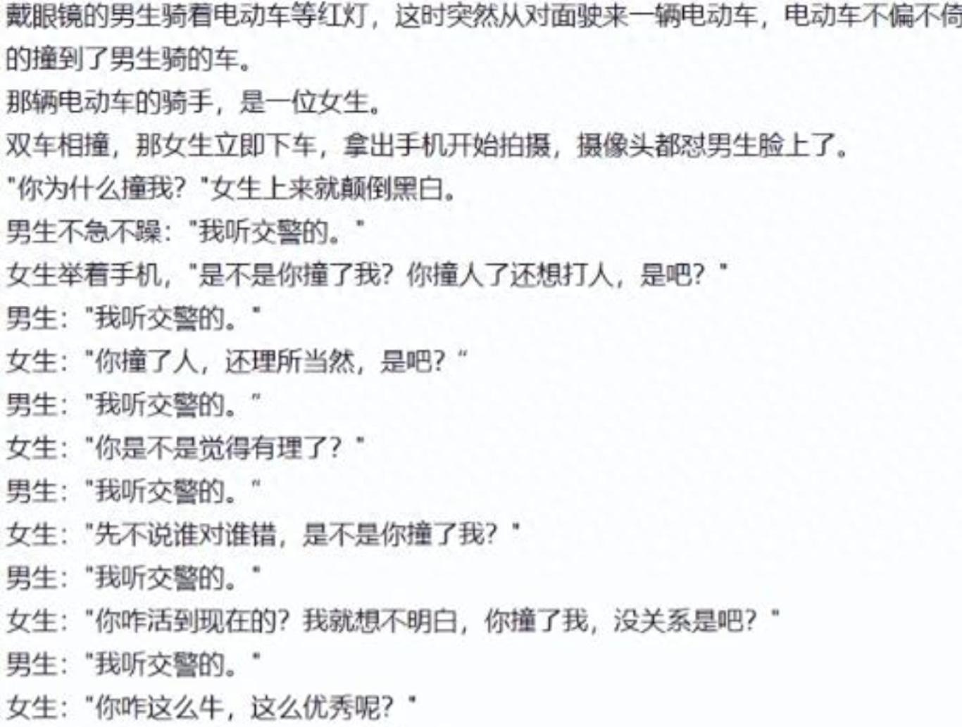 交警到场后直接给出了判定:电动车逆行,全责妥妥的。按理说,这事儿到这儿就算告一段落了,但你绝对猜不到接下来发生了什么——这电动车女主的操作,让我的键盘都要按到歇斯底里。
