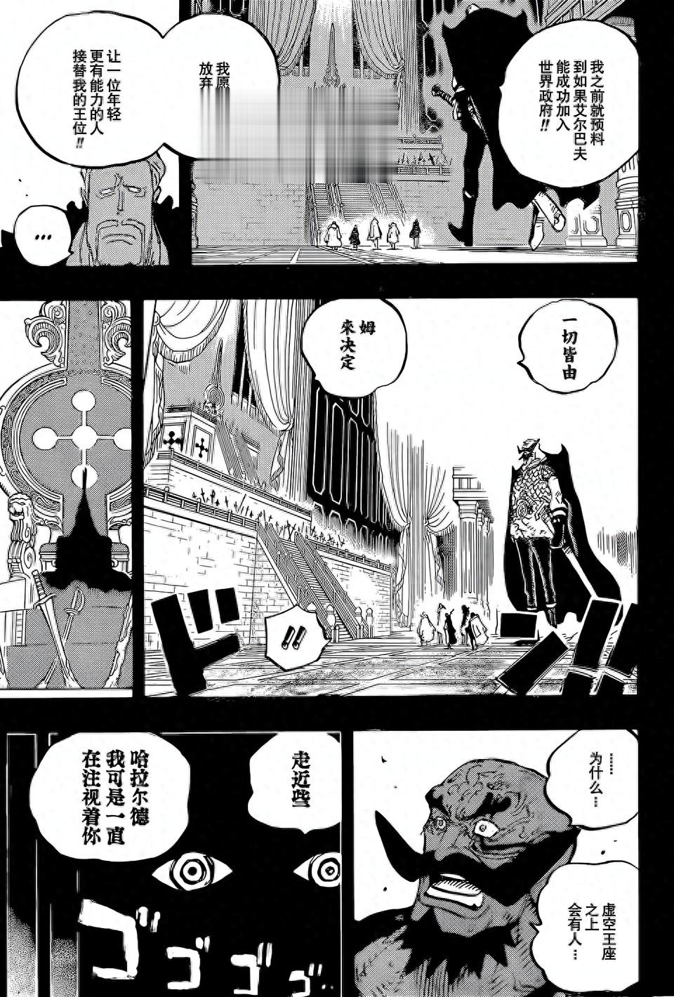 哈拉尔德国王的回忆还没有结束,他的死亡真相即将曝光,哈拉尔德国王一直想让巨人族加盟世界政府。洛克斯本想跟哈拉尔德国王结盟一起对付世界政府,但哈拉尔德国王不相信洛克斯,反而相信世界政府,他彻底投降了世界政府,五老星让他成为神之丛刃。