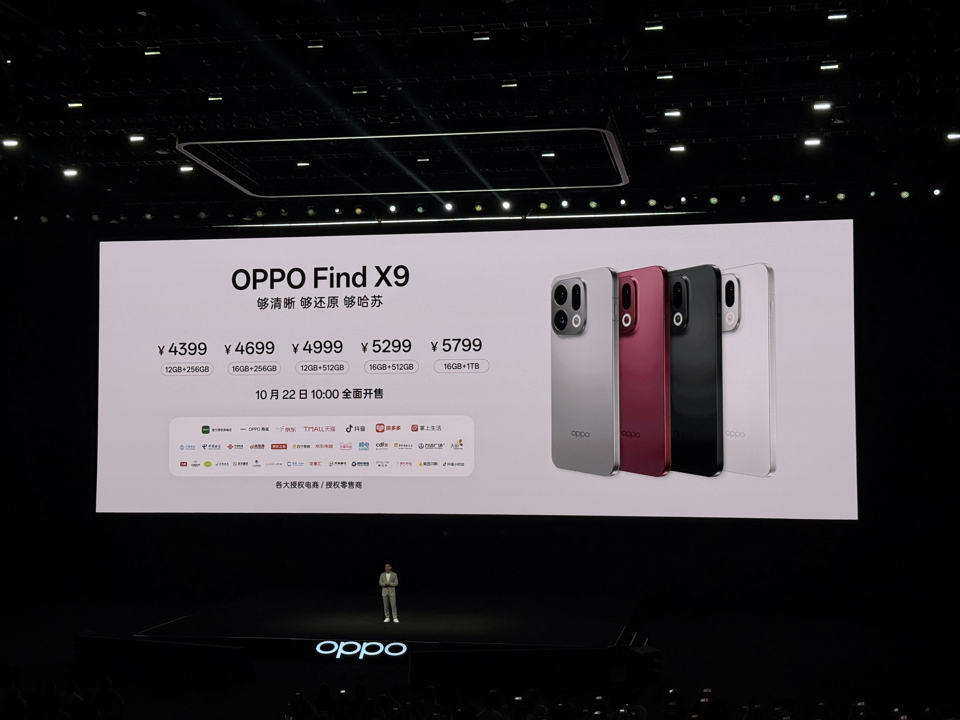 4399元起,天玑9500驱动性能够强了性能方面,OPPO Find X9 系列采用了联发科天玑 9500 移动平台,提供 12GB、16GB 两种内存规格和 256GB、512GB、1TB 三种存储版本。OPPO Find X9 提供雾黑、霜白、绒光钛、追光红四款配色;OPPO Find X9 Pro 提供霜白、绒砂钛、追光红三种配色。