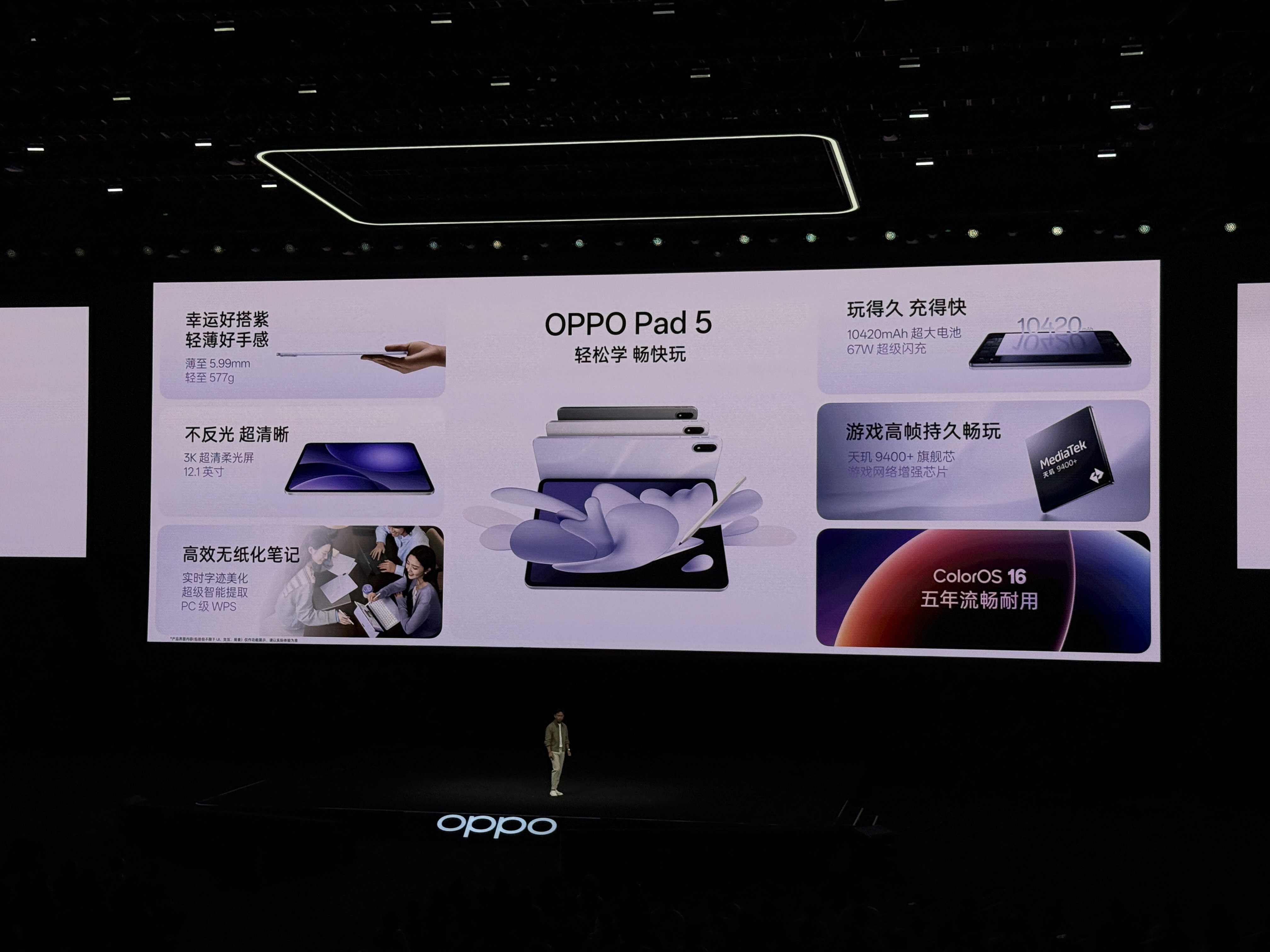 全新的 OPPO Pad 5 采用了 12.1 英寸 3K 高刷屏,搭配旗舰级天玑 9400+ 移动平台和 10420mAh 电池,可以告别性能和电量焦虑。