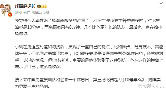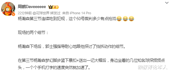 媒体人周鹏则是吐槽50号裁判抢戏为杨瀚森打抱不平,杨瀚森下场后,郭士强指导耐心地跟他探讨了挡拆动作的细节。在第三节杨瀚森梦幻脚步篮下暴扣+送出一记大帽后,身边坐着的几位知名球探频频点头,一个个手机打字的速度突然就加速了。