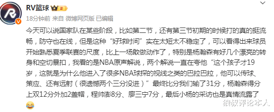 根据美媒原声解说,对于杨瀚森的表现给出了很高的评价说道:这个孩子才19岁,这就是为什么他进入了很多NBA球探的视线,他可以传球、策应、还有远射(很遗憾两个三分没进)”。