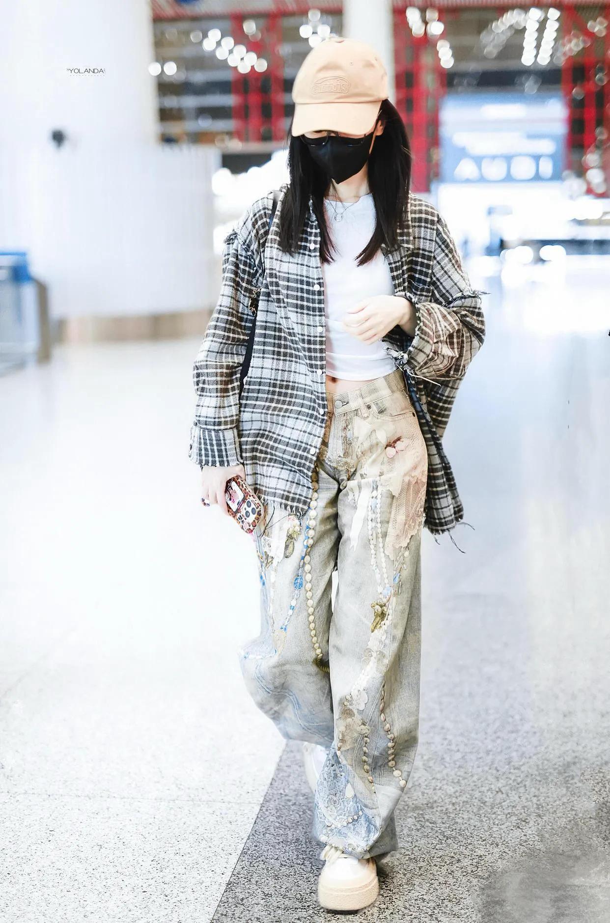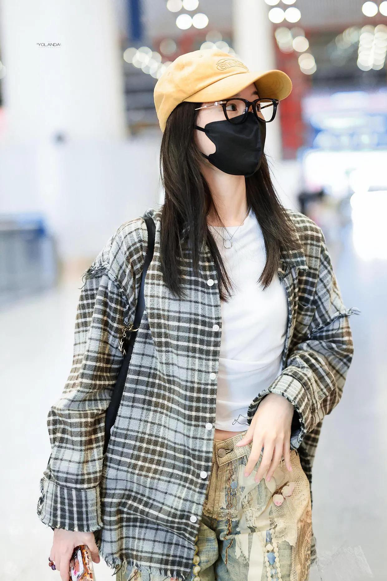 毛晓彤机场私服真会穿!格子衬衫+白短T+牛仔裤,休闲随性又时髦!