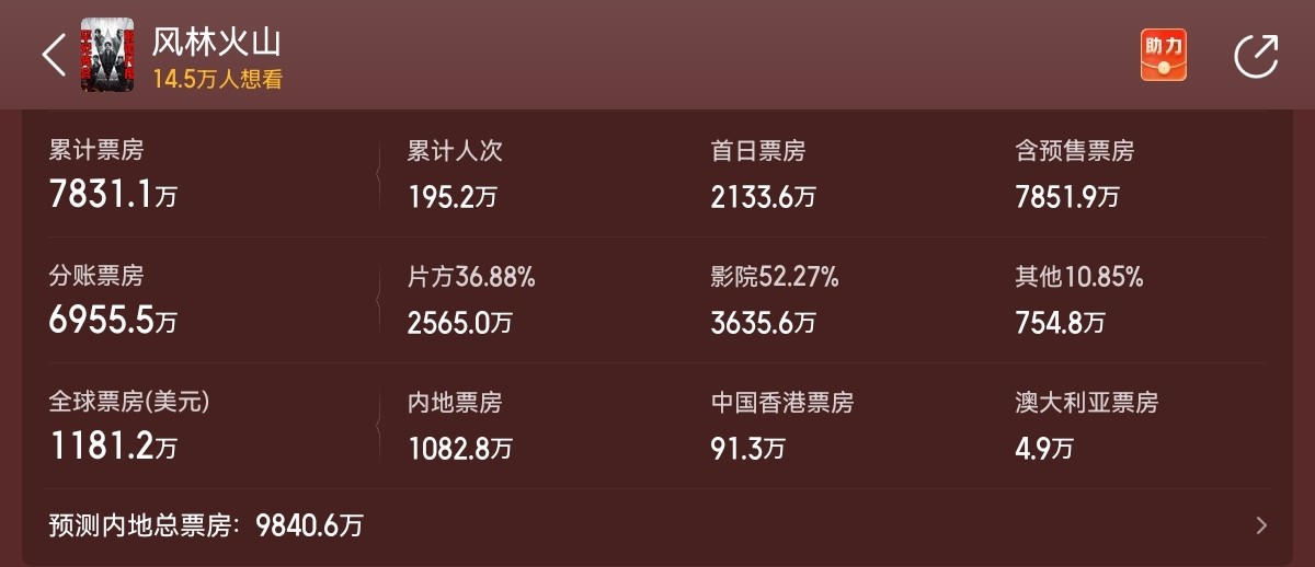 第五部,《风林火山》,票房7800万