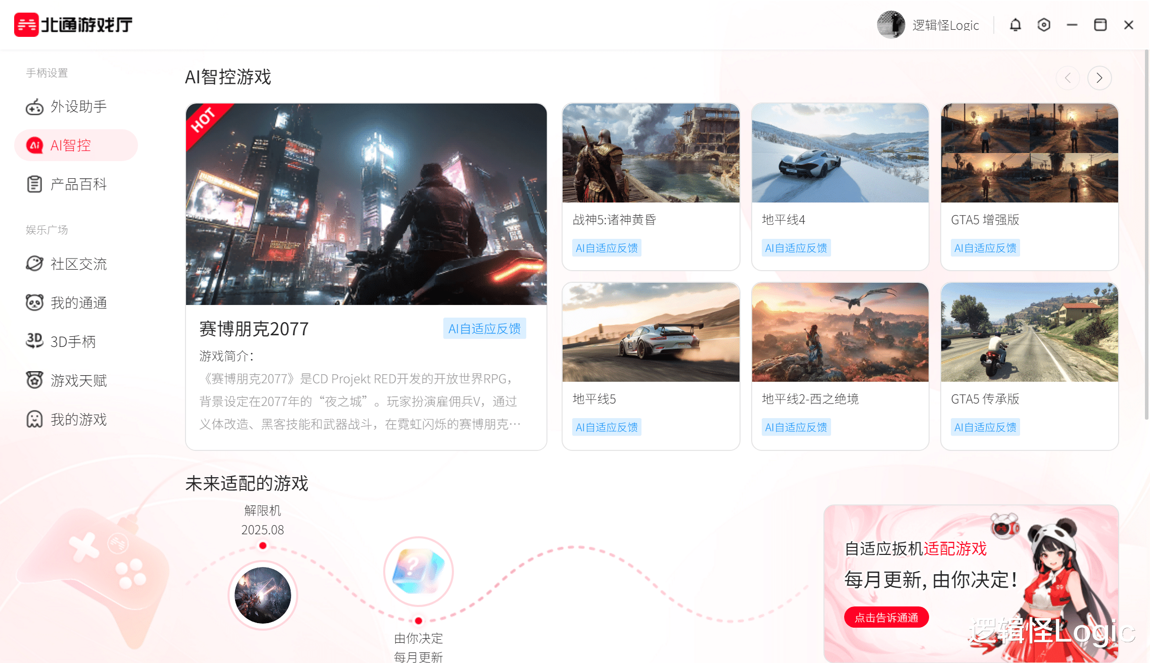北通游戏厅AI智控的加入,让玩家的游戏体验更有身临其境的感受,现阶段AI智控的游戏有:黑神话悟空、地平线4、地平线5、赛博朋克2077、战神5等游戏,并且还给出了未来适配游戏的时间节点,并且每月都会更新。