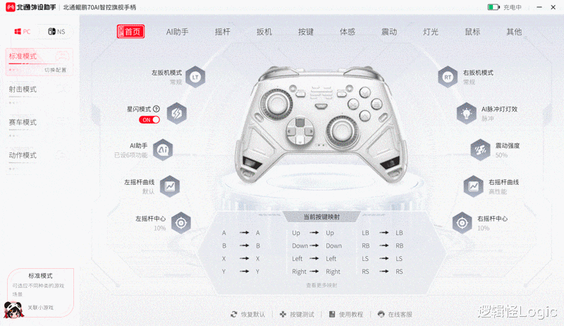 北通游戏厅设计有一个外设助手,通过助手能够自定义设置手柄的各项参数。在标准、射击、赛车、动作4种模式下,手柄的AI助手、摇杆、扳机、按键、体感、震动、灯光、鼠标、其他等细分功能内,都能够进行很细节的调整,外设助手的加入,让手柄的可玩性、DIY配置都有了很充分的发挥空间。
