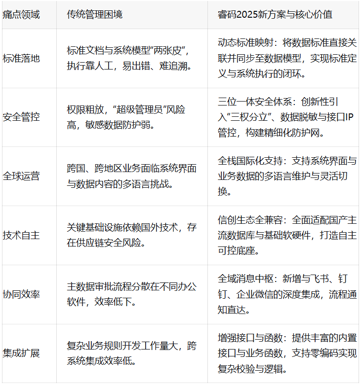 如果说上述功能构筑了平台的坚实基础,那么2025年全新发布的睿码主数据管理平台Cloud V2.7.3版本,则代表了其在智能化、安全性与生态化维度的一次战略性跃迁。本次升级直面企业数字化转型的深层痛点,推出了六大核心新功能,不仅强化了平台能力,更重新定义了主数据管理的价值标准。