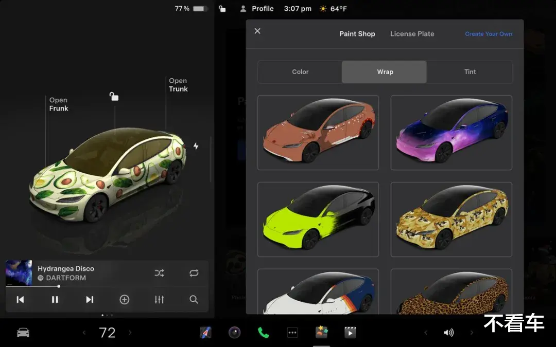 通过车窗贴膜、定制车身贴膜和车牌,打造个性化的特斯拉虚拟形象。您可以选择众多预设设计,也可以使用U盘创建并上传您自己的设计,让您的爱车独一无二。