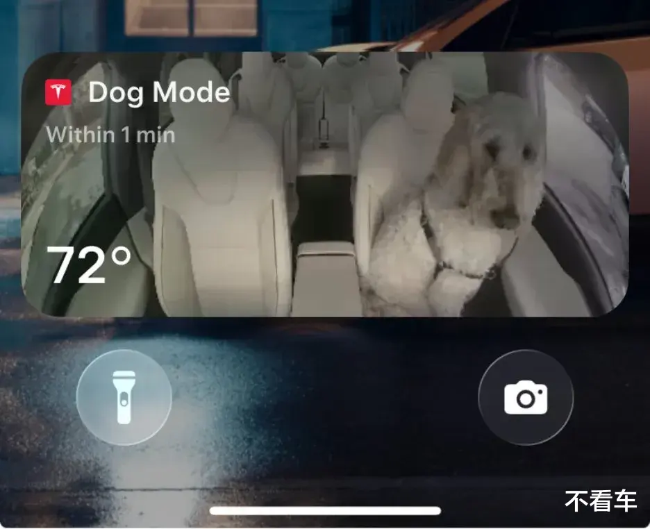 启用“狗狗模式”后,您的 iPhone 上会显示“实时活动”,定期拍摄车厢内的照片,并实时更新温度、电池电量和气候状况。