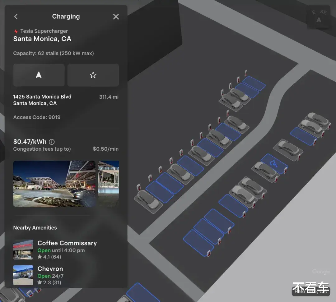 现在,您可以点击“查看站点地图”查看部分特斯拉超级充电站的 3D 视图。导航至试点站点时,抵达后将显示站点布局和实时占用情况(可用/已占用/故障)。