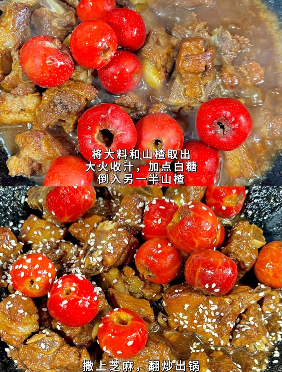 4.将大料和山楂取出,大火收汁,加点白糖,倒入另一半山楂,撒上芝麻,翻炒出锅
