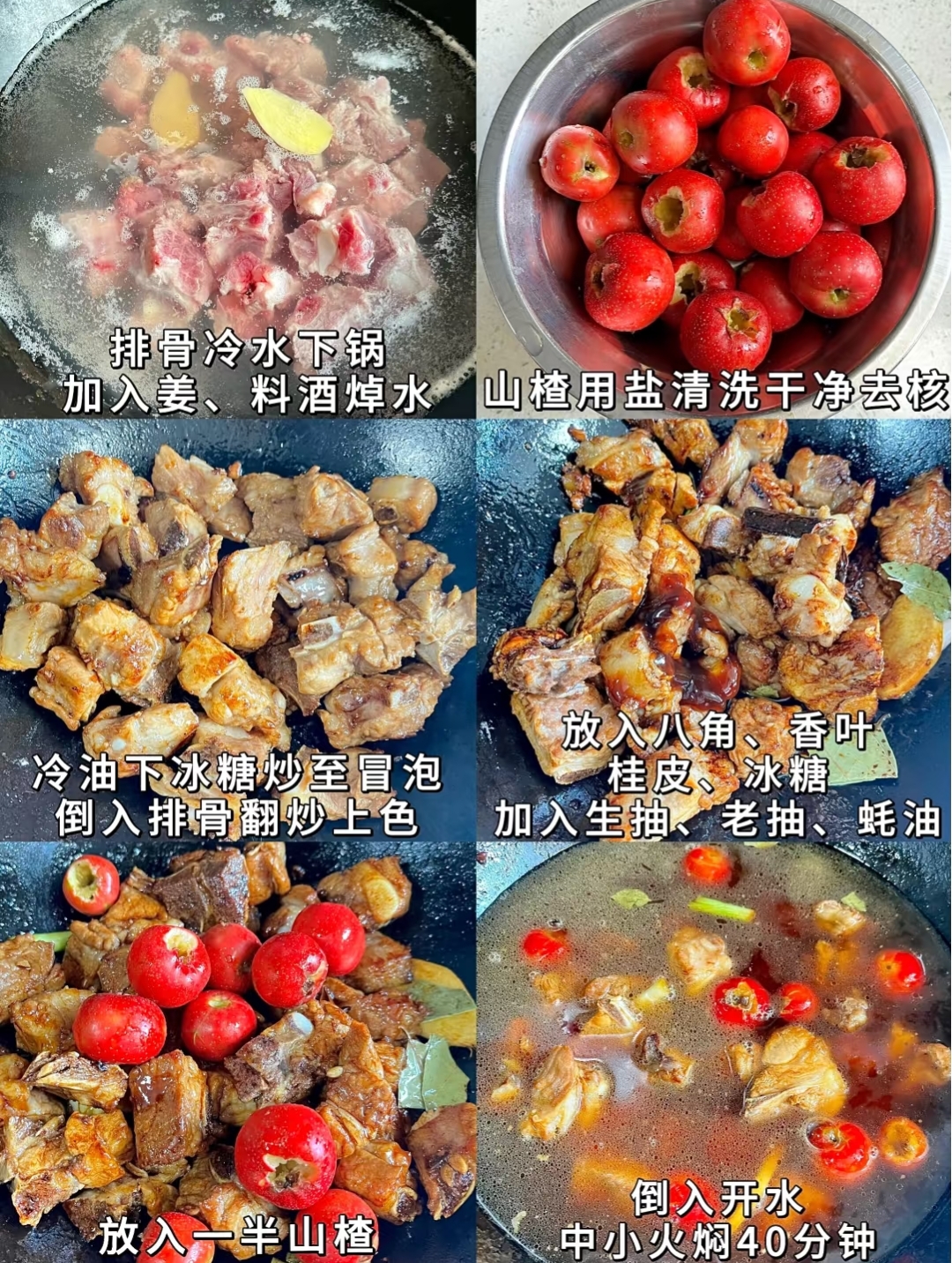 3·冷油下冰糖炒至冒泡,倒入排骨翻炒上色,放入八角,香叶,桂皮,冰糖,加入生抽,老抽,蚝油,放入一半山楂,倒入开水,中小火焖40分钟