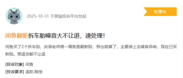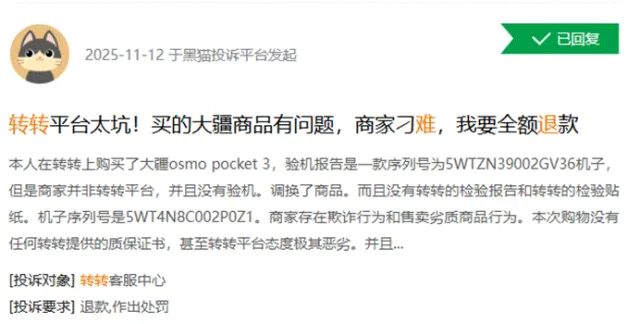一位用户投诉称:“在闲鱼买了2个拆车胎,安装老师傅一看就是翻新胎,那也就算了,主要装上去噪音异响。”还有用户称:“转转平台太坑!买的大疆商品有问题,商家刁难,我要全额退款”……