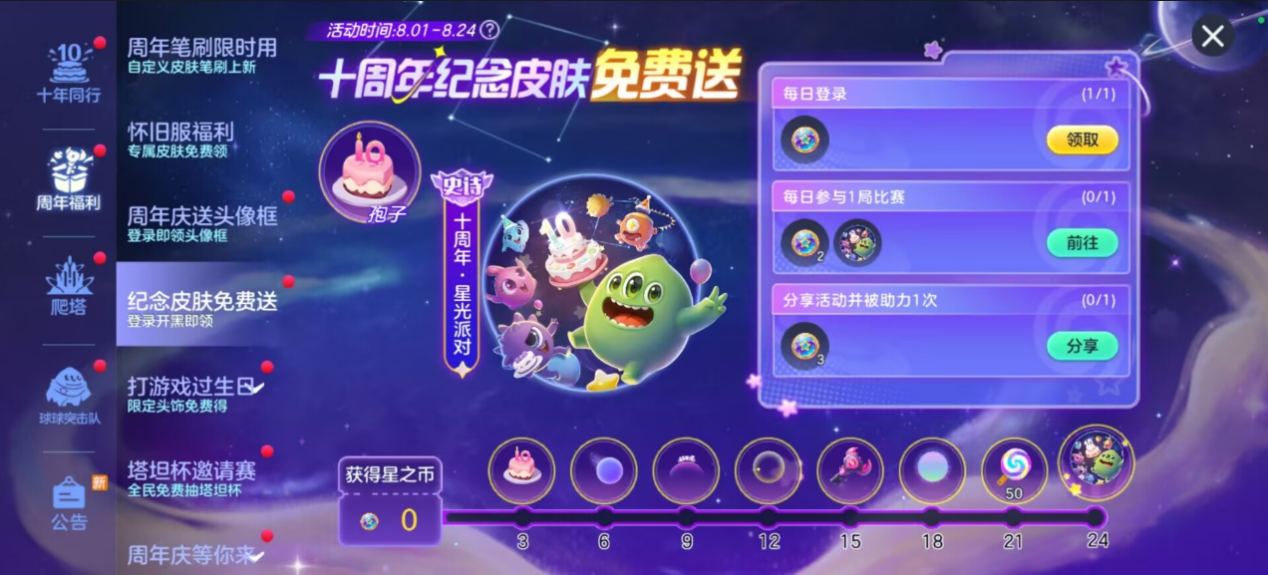 8月1日至8月24日,免费得永久十周年纪念专属皮肤套装,「孢子·十周年·美味蛋糕」、「残影·十周年·喜悦痕迹」、「头饰·十周年·生日发卡」、「腰饰·十周年·许愿星」、「光环·十周年·欢庆聚会」、「关键词·十周年·星光派对」,绝版收藏,体验游戏即可永久获取!