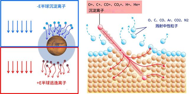 与地球不同,火星几乎没有全球性磁场保护,因此太阳风可以直接与火星大气相互作用。在这种情况下,太阳风中的离子会被加速并撞击火星高层大气,将足够的能量传递给大气分子,使它们获得超过逃逸速度的动能,最终逃逸到太空中。